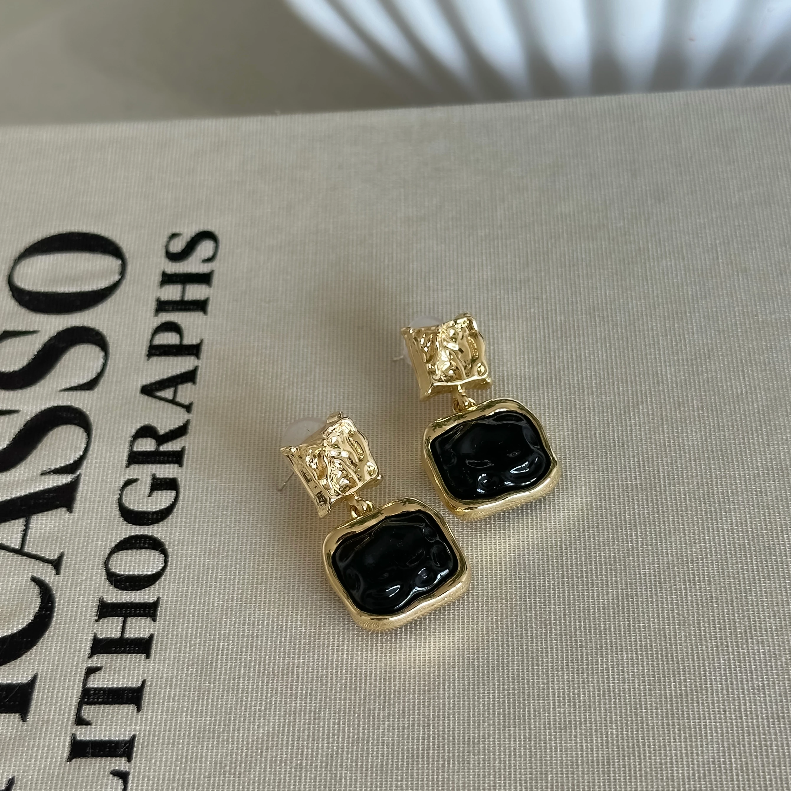 Siyah Dolgulu Kare Vintage Gold Küpe